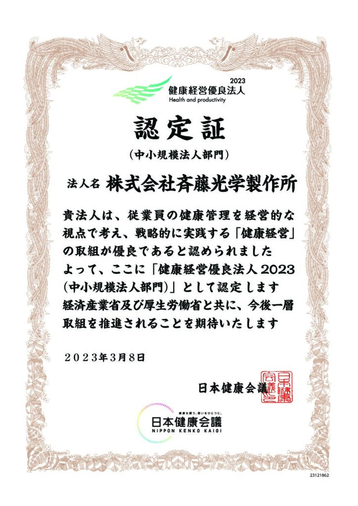 ㈱斉藤光学製作所は、経済産業省と日本健康会議が共同で実施する「健康経営優良法人2023(中小規模法人部門)」に認定されましたことをお知らせいたします。当社は会社ビジョンである働きがいのある会社組織の実現のため、社員が最大限の能力を発揮できる会社づくりを推進してまいりました。
