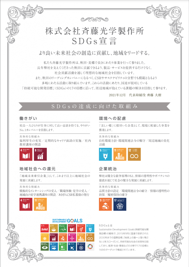 また、秋田のリーディングカンパニーになるべく、CSRやサステナビリティの分野でも模範となるよう多岐にわたる活動に取り組んでいます。これらの活動にあたり、国連が提唱している「持続可能な開発目標」(SDGs)の17の目標に沿って、周辺地域が抱えている課題の解決を目指して参ります。