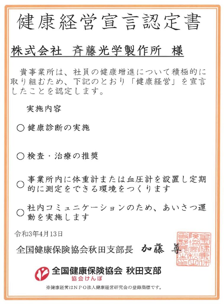 ㈱斉藤光学製作所は、会社ビジョンである働きがいのある会社組織を実現するためには、全社員の体と心が健康で、最大限の能力を発揮できることが重要であると捉え、「物心両面の幸せを目指す」という経営理念のもと、健康経営に力を入れて取り組む事を宣言します。
